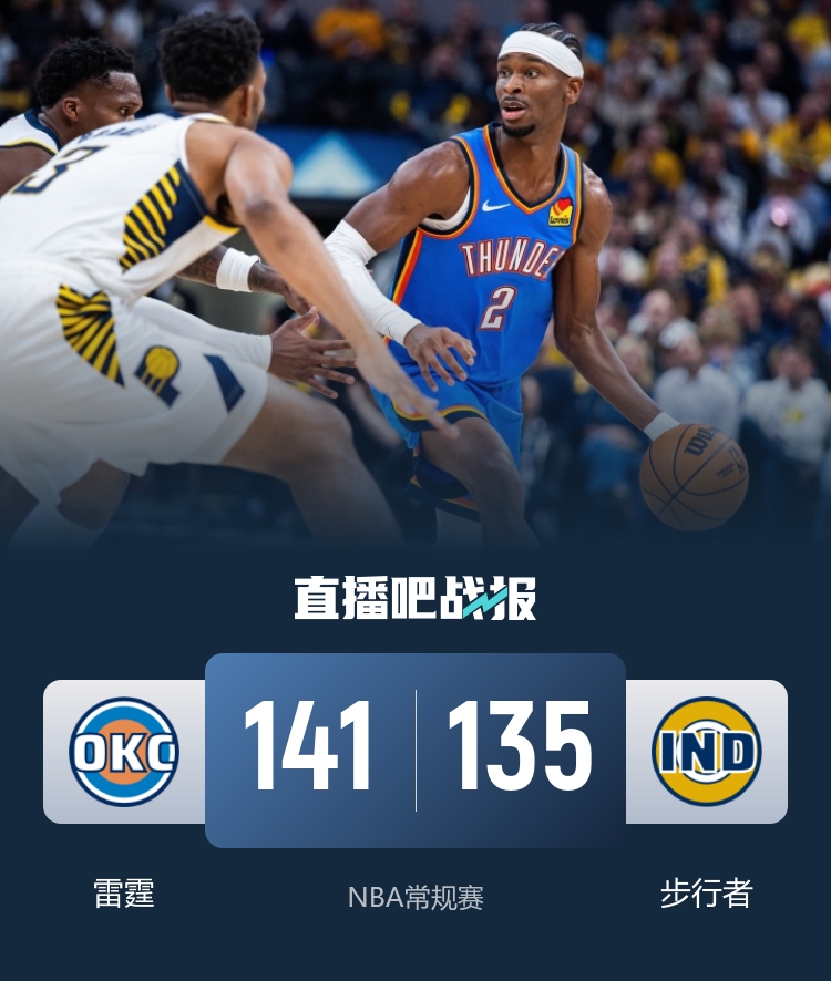 加时赛,步行者连续抢到进攻篮板5-0建立领先,但阿杰伊-米切尔抛投2+1再追平,亚历山大中投命中马瑟林挑篮再回应,双方再进加时。第二个加时,亚历山大造成马瑟林6犯,阿隆-维金斯连续三分命中雷霆领先到7分,谢泼德6犯再被罚下,最终雷霆加时141-135力克步行者。