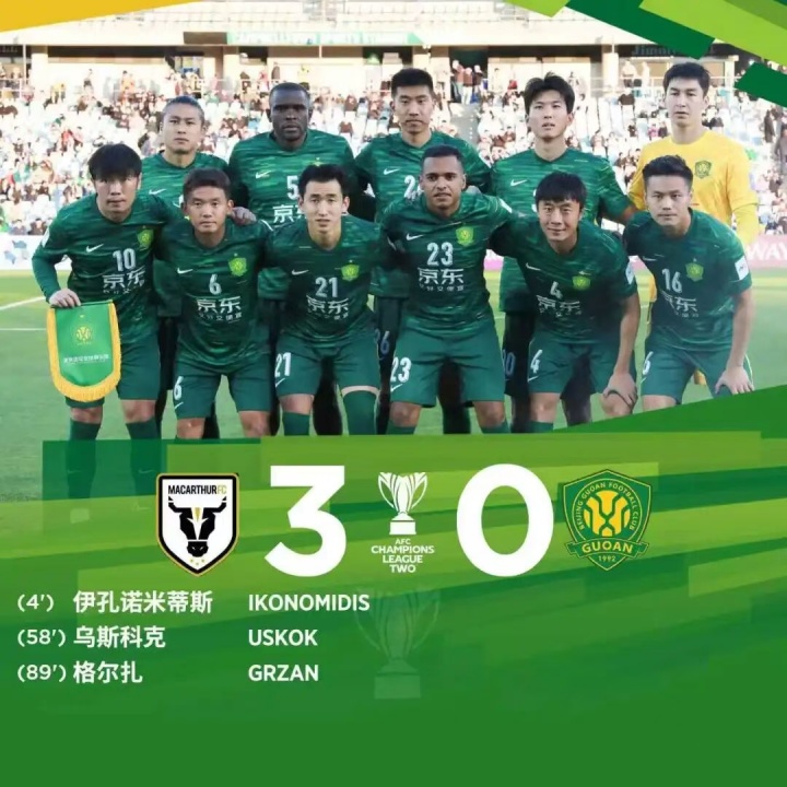国安官方在本场比赛的战报中写道:“10月2日,在2025-26亚冠二级联赛小组赛第2轮中,北京国安客场0-3负于麦克阿瑟FC。上半场比赛第4分钟,对方由伊孔诺米蒂斯打入一球。面对澳超球队的身体对抗强度,北京国安明显不太适应。第12分钟,张玉宁禁区边缘大力抽射,没有命中球门。第23分钟,李磊前插到禁区内射门,球被对方门将化解。最后时刻,李磊的前插再度制造威胁,可惜没有形成射门。上半场比赛结束,北京国安0-1麦克阿瑟FC。易边再战,第52分钟,张玉宁禁区外倒钩射门偏出。第58分钟,对方由6号乌斯科克再入一球。随后,国安接连换上法比奥、古加、曹永竞、林良铭和塞尔吉尼奥等队员加强进攻。第71分钟,古加禁区前沿的远射偏出。第89分钟,麦克阿瑟FC由格尔扎攻入第3球。最终,北京国安客场0-3负于麦克阿瑟FC。